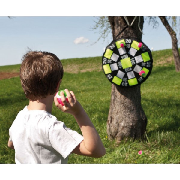 In acest joc, la tinta nu aruncam cu sageata, ci cu mingi. Mingiile nu vor cadea de pe tinta, deoarece acestea sunt prevazute cu arici adeziv (Velcro). La sfirsitul jocului tinta poate fi dezumflata si depozitata in geanta. Poate fi folosit in interior dar este ideal si pentru excursii.