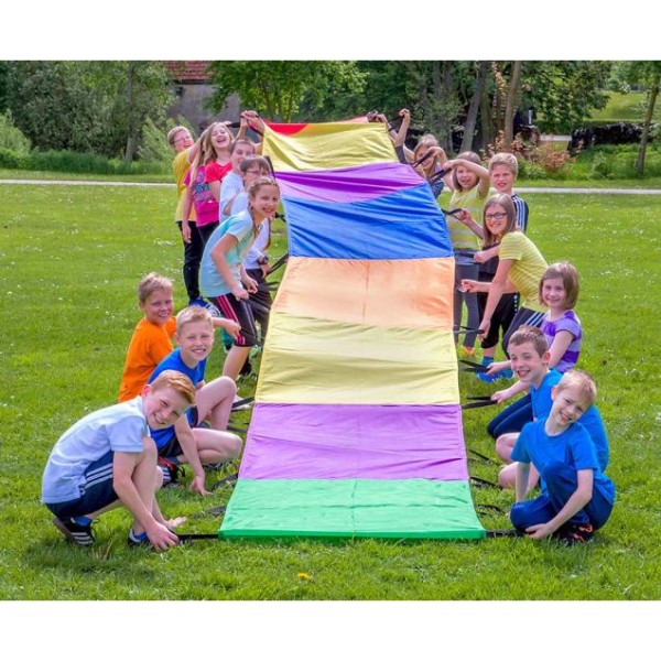 Această parașută dreptunghiulară le permite copiilor să se distreze dar și să își