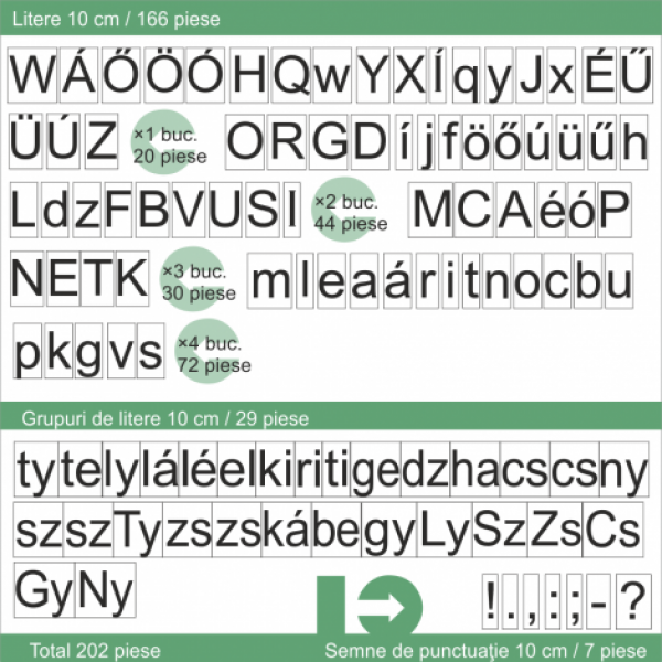 plăcuțe cu litere, grupuri de litere și semne de punctuație;