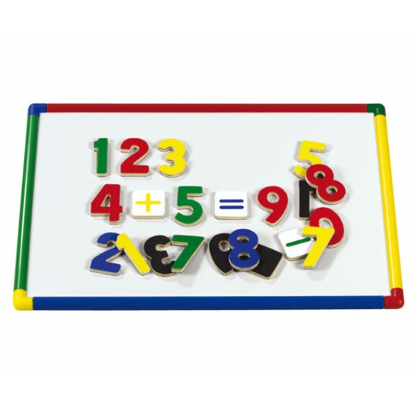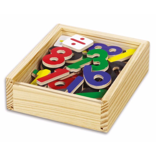 Setul este ambalat in cutie de lemn cu capac transparent si contine 32 cifre si 5 semne matematice din lemn de culori diferite. Spatele numerelor este acoperit de un material magnetic pentru o aderenta perfecta la tablele metalice.