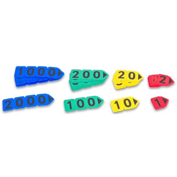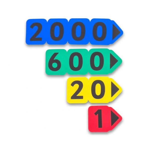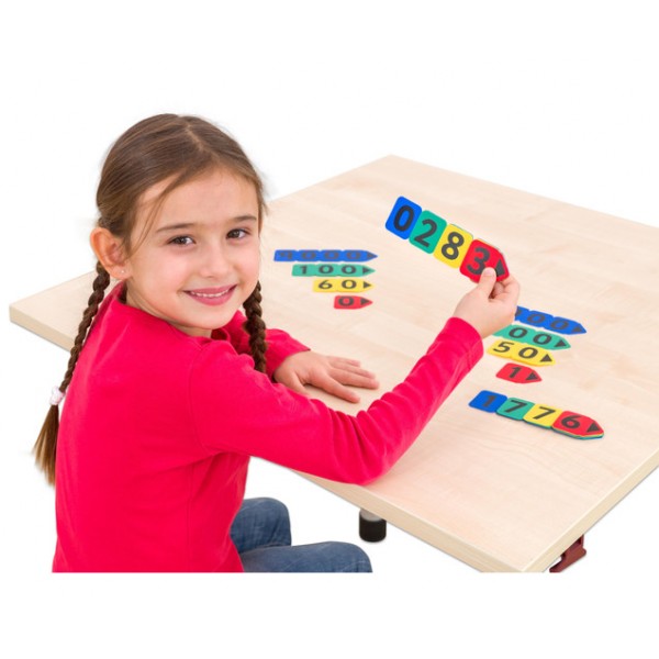 Ideal pentru înțelegerea sistemului zecimal. Toate valorile sunt imprimate pe carduri colorate diferite. Culorile corespund fiecărui ordin (unități, zeci, sute și mii).