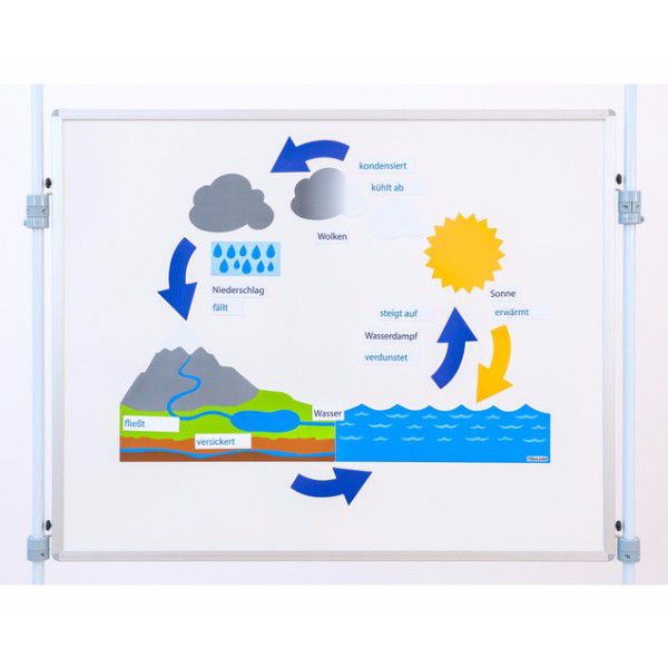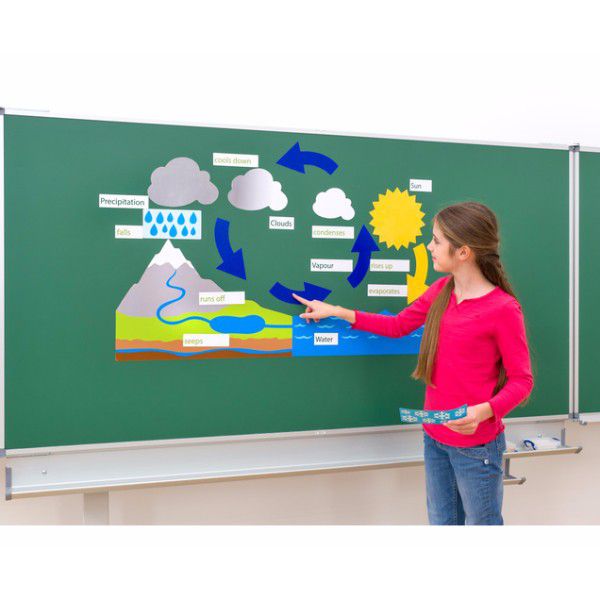 Set de folii magnetice care se ataseaza pe tablele metalice. Acest kit permite explicarea simpla a circuitului apei in natura. Elevii identifica foarte usor etapele prin care apa se evapora, urca si formeaza norii, apoi, prin precipitatii, apa ajunge pe pamant, este colectata si transportata de rauri inapoi in mari si oceane.